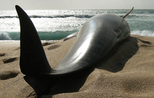 One of 25 pilot whales that died on September 22, 2010 lies in the sand after the whales beached themselves at Spirits Bay, 320 km (200 mi) northwest of Auckland, New Zealand. In the second mass stranding in the area in two months, the Department of Conservation said a pod of 74 pilot whales were found but rescuers were trying to save almost 50 more stranded on the coast. Another 50 whales were offshore and were continuing to strand themselves, regional manager of the Department of Conservation (DOC) Jonathan Maxwell said. (Department of Conservation/AFP/Getty Images)