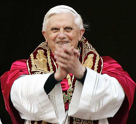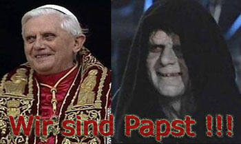 Joseph Ratzinger alias Benedikt der Papst wird im Bundestag eine Rede halten. Alle Parteien sind dafür, mittlerweile auch die Grünen. Einen Unterschied gibt es allerdings: Die Grünen sind auch dafür, daß alle anderen Religionsführer ihren Sermon im Bundestag verbreiten können. Während wir uns also auch auf iranische Steinigungspropaganda und hinduistische Kasten-Ideologie freuen dürfen, genießen wir erst mal die toten Augen von Benedikt und sein Vergebungs-Geleier.- Etwa so: